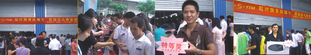 “哈哈。我抽到了一个旅行箱”,这是抽到了自己心仪的奖品的幸运者的欢呼声;“哎,怎么是一瓶可乐啊”,这是抽到了纪念奖后有点小失望的惋惜声。“快点,动作快点”,这是排队等候着抽奖的员工满怀期待的催促声。各种各样的声音与欢笑声汇聚在一起,让场面热烈非凡。现场的气氛与炎热的天气交相呼应,抽奖以及派发奖品的工作人员满头大汗,却依然满带笑容的忙碌着,期待着大奖能在自己面前的抽奖箱中产生。